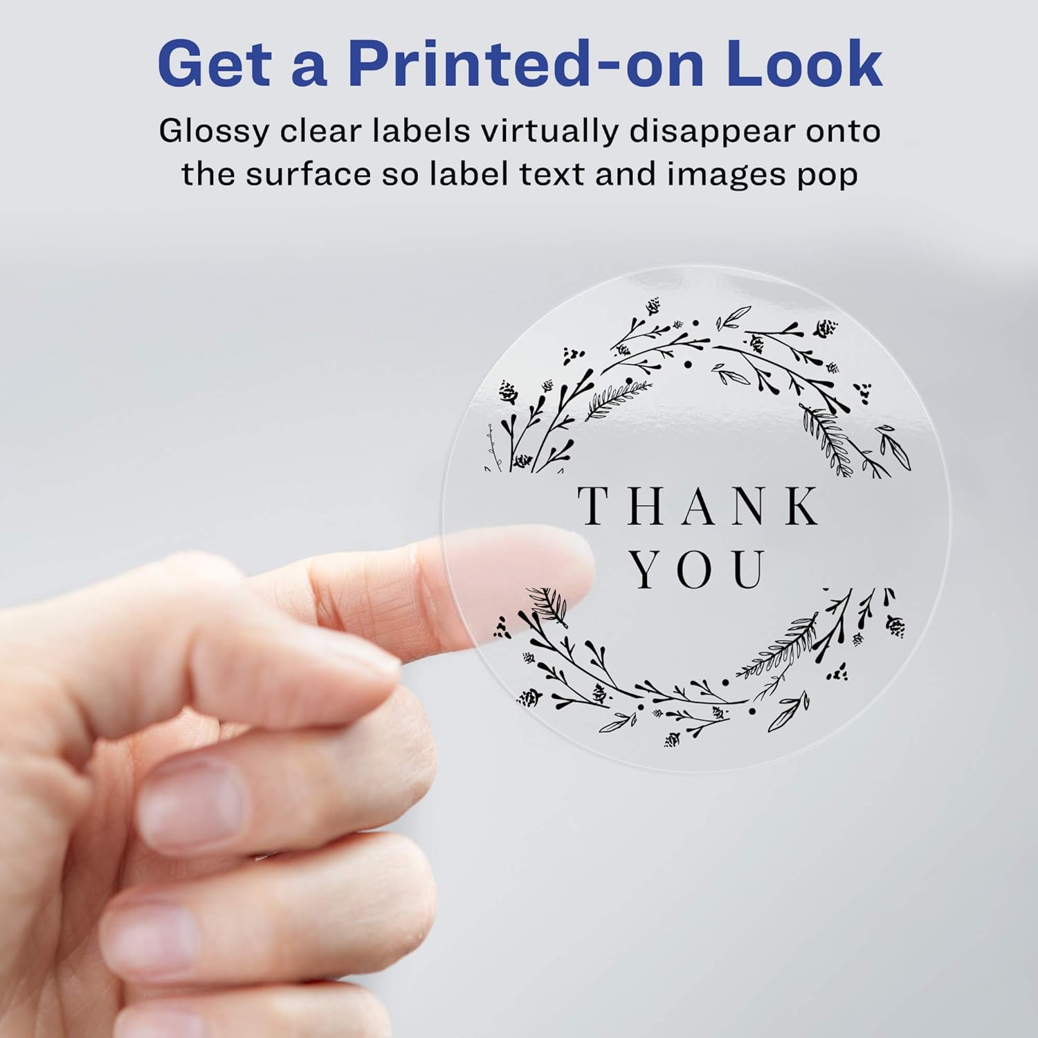 Glossy clear round identification labels virtually disappear onto surfaces with a luxurious, shiny finish. Create a professional, custom-printed look on a variety of items, from product packaging, marketing materials and business presentation folders, to containers, equipment and gifts. These printable multiuse labels feature Sure Feed technology for a reliable feed through your printer, to acoid misalignments and jams—and that means no more wasted labels. Label stickers stick to a variety of surfaces including metal, plastic and paper, and are archival safe and acid free to prevent yellowing over time. Customize your round sticker labels with free designs and templates at avery site, and print with laser or inkjet printers. These multipurpose labels can be used for a variety of projects to help organize and identify. For home organization, create bin labels, toy bin labels, storage bin labels and other container labels to mark what's inside and create kids ID labels to tag belongings. Use the sticker labels in the office or storeroom to label shelves, mark property such as electronics, office equipment, office supplies and bins with labels to show ownership. Make classroom labels to mark classroom property, labels for classroom supplies and equipment, and create name label stickers for student projects. Personalize gifts and party favors with these customizable labeling stickers. These label stickers can also be used as jar stickers, pricing stickers and food label stickers for your products and packaging.