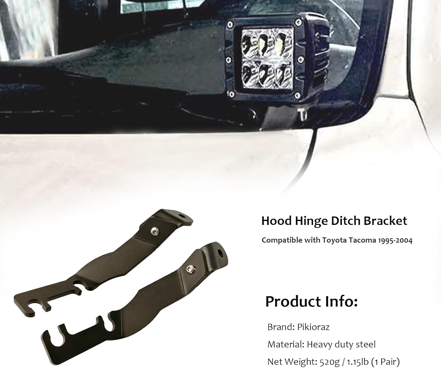 Engine Hood Hinge Ditch LED Light Brackets, Hood Cowl Panel LED Light Bracket Compatible with Tacoma, Metal Hood Mount Suitable for Toyota Tacoma Truck 1995-2004 Specification: Material: metal Color: black Package Size:22x11x4CM Weight:620G Quantity:2Pcs Package Includes 2 X engine hood hinge ditch brackets for Tacoma Warm Tips: 1)Due to the light and screen setting difference,the item's color may be slightly different from the pictures 2)Please allow slight dimension difference due to different manual measurement Your satisfaction is our greatest pursuit,please feel free to contact with us if you have any question.We will reply you in a working day