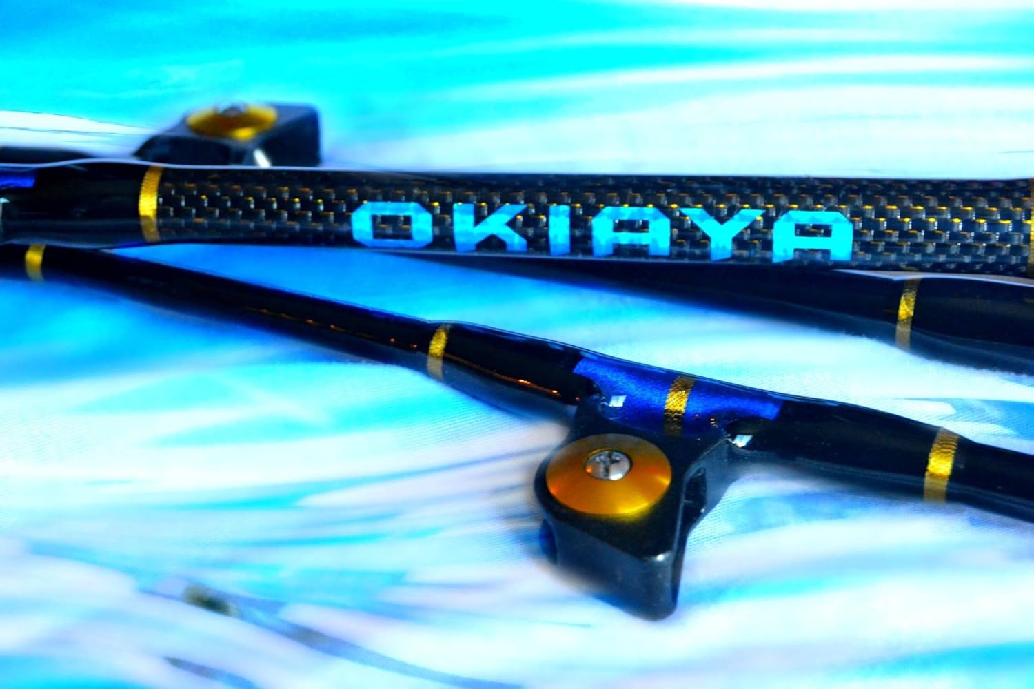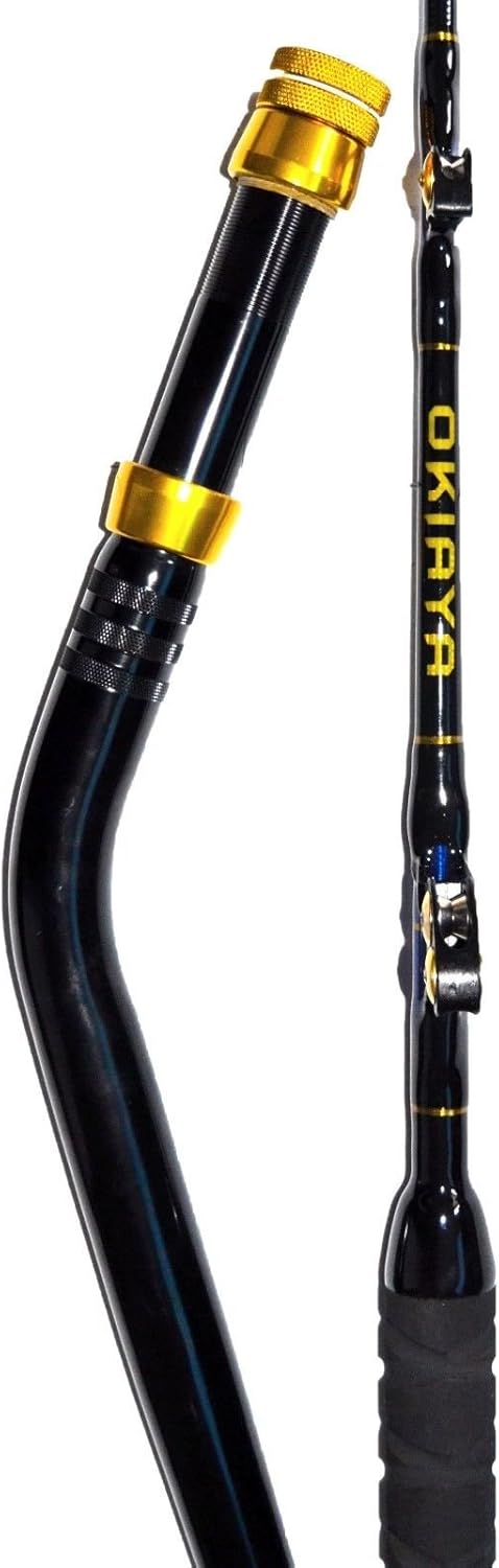 Genuine OKIAYA OFFSHORE DEEP DROP BENT BUTT VENOM PRO CARBON FIBER 80-160LB. Class Rod. These are black blanks with royal blue and gold trim. All rods individually wrapped in a protective sock with our custom OKIAYA label. THREE roller guides and a PAC BAY SWIVEL TIP. Perfect for offshore trolling for Dolphin, Wahoo, Marlin, and Tuna. Featuring a classic design with use of CNC machined aircraft grade alloys for strength Composite fiber main shaft for superior strength, Super smooth PAC BAY rollers and durable hardware that keeps it looking good year after year. X-Grip foam grip and OKY Cross-cut aluminum gimbal bent butt handle. Meets or exceeds all IGFA standards for all big game competitions Overall rod length 1.66M (5'2") OKIAYA rod cover included two piece heavy action Designed in the United States.