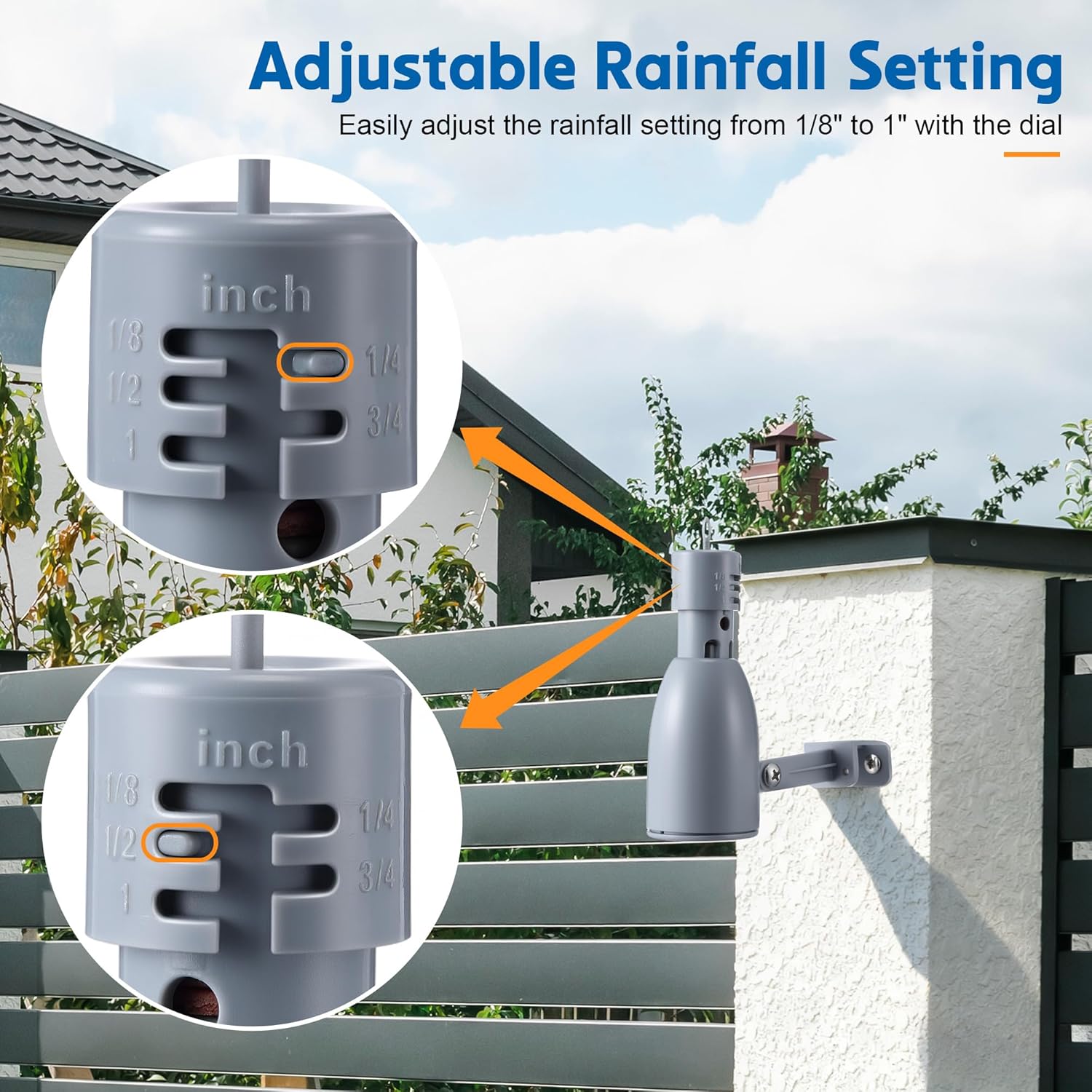 Wired Rain Sensor for Sprinkler SystemsUpgrade your irrigation system with this Wired Rain Sensor, designed to automatically pause watering during rainfall. It features adjustable rainfall sensitivity (1/8"–1"), 180° adjustable bracket, 21.3 ft cable, and is compatible with most 24V AC sprinkler controllersWorking Principle (Mechanical Type)The sensor connects to your sprinkler controller via cable and detects natural rainfall to pause irrigation automatically. Dry Weather: The hygroscopic discs inside the sensor remain dry and compact, keeping the micro switch closed. The controller operates normally, and watering continues as scheduled. During Rainfall: The discs absorb water and expand, causing the micro switch to open. This sends a signal to the controller to pause irrigation, preventing overwatering. After Rain Stops: The discs dry and shrink, allowing the micro switch to close again. The controller then resumes its normal watering program. Electrical SpecificationsThe electrical rating of the switch is 1A, 36VWhen rainfall is below the settings, the switch is in a conducting stateWhen rainfall exceeds the settings, the switch is in a disconnected stateSettings and Adjustmentsa. Turn the rainfall adjustment dial to a required settingb. Connect two wire ends to Common Terminal and Sensor Terminal & nbsp. c. The controller watering programs will be suspended or skipped when rainfall exceeds the set levelPackage includes1 x Wired Rain SensorNote1. Ensure your controller's input circuit is compatible with the sensor's electrical rating. 2. Do not submerge the rain sensor in water. Winding risk may exist, please keep our product away from children